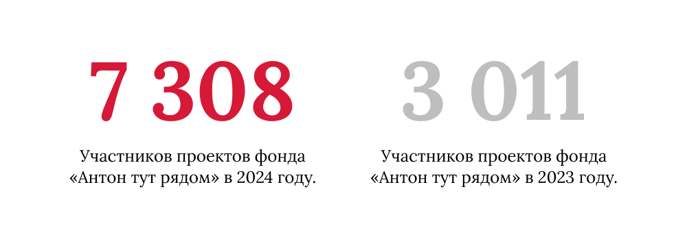 Год, когда количество человек, которым смог помочь фонд «Антон тут рядом», выросло более, чем в 2 раза: с 3 011 участников проектов в 2023 году до 7 308 человек — в 2024. Благодаря развитию консультационных и образовательных сервисов, а также вашей поддержке.
