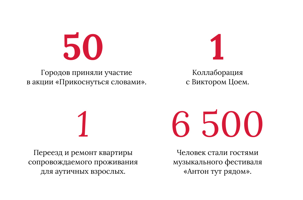 Если времени нет, то стоит ли подводить итоги в конце календарного года? Ведь деятельность фонда не завершается в декабре и не начинается заново в январе — время и процессы внутри фонда бегут с огромной скоростью, не останавливаясь ни на секунду. В один и тот же момент в центре «Антон тут рядом» на Невском репетирует инклюзивный оркестр и обжигается в керамической печи коллекция новых тарелок. На другой площадке идет занятие с Марком по дополнительной коммуникации и сенсорная интеграция с Тасей, в столярке Леша выпиливает шкатулку, в тренировочной квартире в этот момент лепятся первые в жизни Никиты пельмени, параллельно в дальнем кабинете фонда идет консультация по образовательному маршруту с Викторией и маленьким Сашей, Анна стажируется на своей первой в жизни работе в офисе, Инна Николаевна с юристом фонда выигрывает дело в суде, а Ваня в сопровождении тьютора адаптируется за партой в ИТМО и слушает урок по химии. Врач-волонтер Айсылу в эту самую минуту консультирует семью и выписывает рецепт, а на экранах компьютеров педагогов из самых разных уголков страны идет лекция про адаптацию среды для аутичных учеников. На сцене БДТ Алиса и Феофан отыгрывают последние минуты генерального прогона спектакля «Ау».