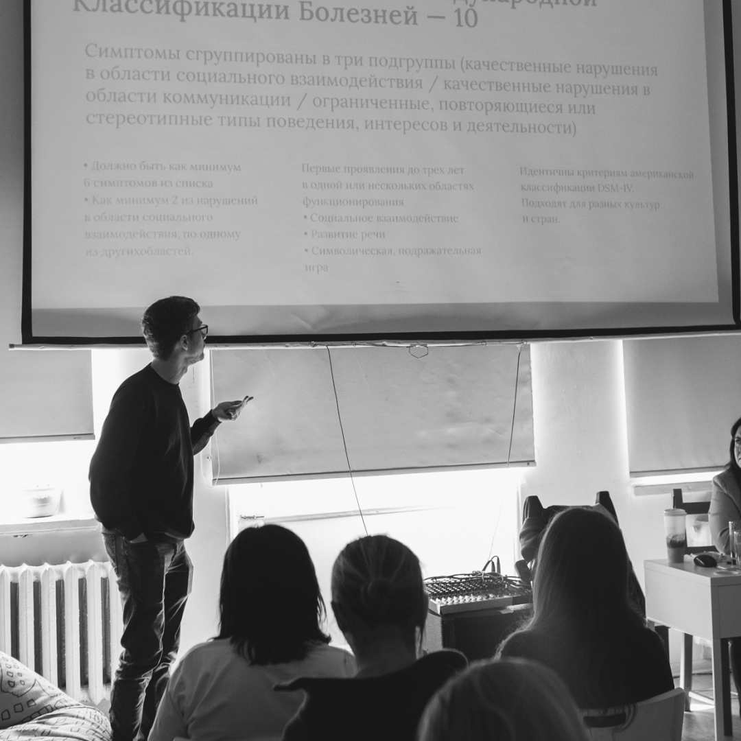 Первая неделя курса — лекции об аутизме от Елисея Осина, врача-психиатра, а вторая — семинар с врачом-педиатром Анастасией Кузнецовой: о РАС, маршрутизации семей и инструментах, на которые могут опираться врачи-педиатры в своей работе.